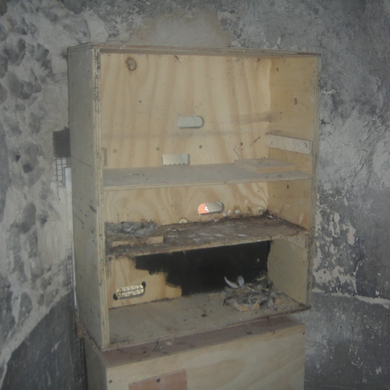 In 2011, the masonry around the louvres on the south side was replaced (see picture at bottom), resulting in one entrance being blocked, but we added another 8 boxes, resulting in 17 accessible entrances. Also a more robust and dependable call playing system was installed. When we checked the boxes in August, there were now 2 boxes with nests, and again 2 chicks in the previously occupied box.